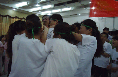 游戲說明:每一組有十一個(gè)人站在一個(gè)長寬50CM方塊上,看那一組堅(jiān)持的時(shí)間長。